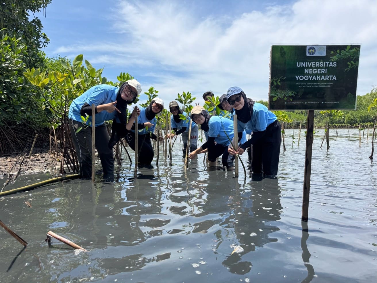 Kegiatan penanaman mangrove melibatkan sekurangnya 100 mahasiswa UNY Departemen Pendidikan Biologi Fakultas Matematika dan Ilmu Pengetahuan termasuk sejumlah mahasiswa asing dari berbagai negara seperti Gambia, Yaman, dan Tajikistan yang didampingi oleh dosen pengampu Dr. Anggi Tias Pratama, S.Pd,M.Pd; Rio Christy Handziko, M.Pd; dan koordinator kegiatan Isti Yunita, PhD.